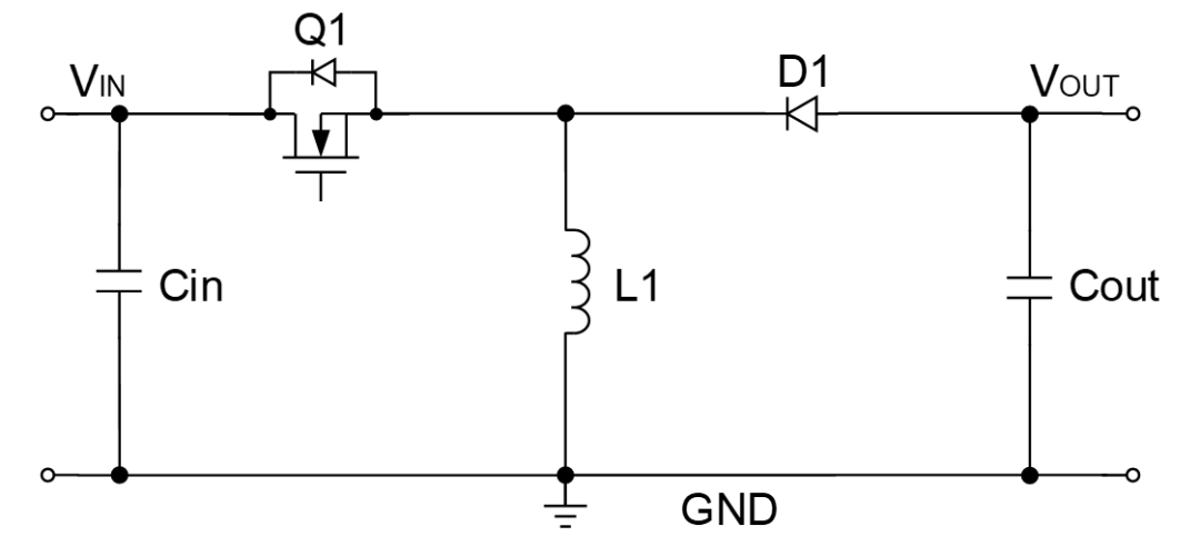 在一个周期内,当MOS管Q1导通时,二极管D1截止,输入给电感L1储能,输出需要的能量靠输出电容维持;当MOS管Q1关断时,二极管D1导通,输入源和电感L1共同给输出提供能量。