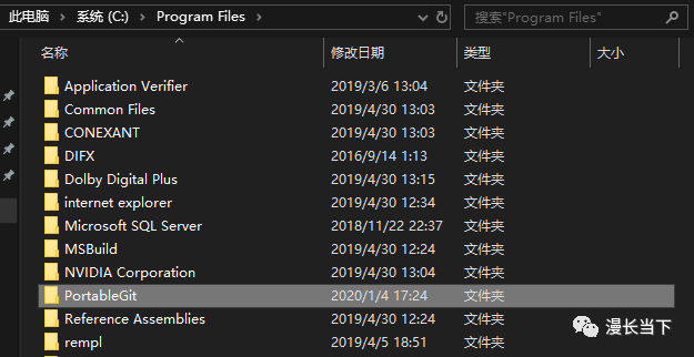 我的安装方式是下载Git(见图6),使用Git里面的ssh服务,下载的时候要根据你的系统来选,可选择安装版和便携版(见图7),我选择的便携版,下载好后,我们将其解压到:C:\ProgramFiles目录(见图8,其它目录也可以),然后进入目录: