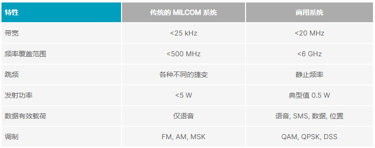 军用通信(MILCOM)系统通常是具有按键通话(PTT)按钮的手持式装备(对讲机),用户可在需要传递语音消息时按下按键。当PTT按键未按下时,可从另一个对讲机接收传入的语音消息。两个无线电之间传递的语音消息在两名士兵之间以无线方式调制、加密、放大和传输。这些MILCOM对讲机与商用手机或通信系统之间存在许多差异,表1仅列出少数一部分。