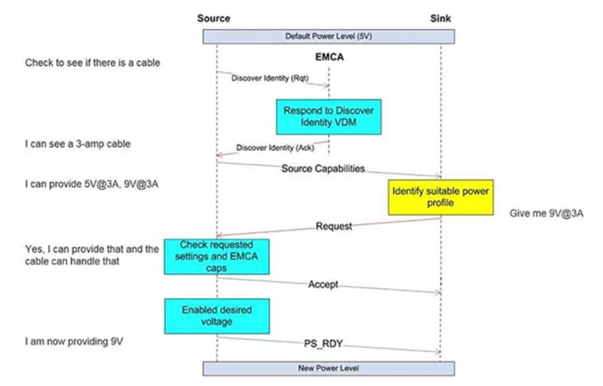图 2 中的流程图显示了通过 EMCA 电缆连接的两个 PD设备之间成功进行功率协商期间的信息交换情况。