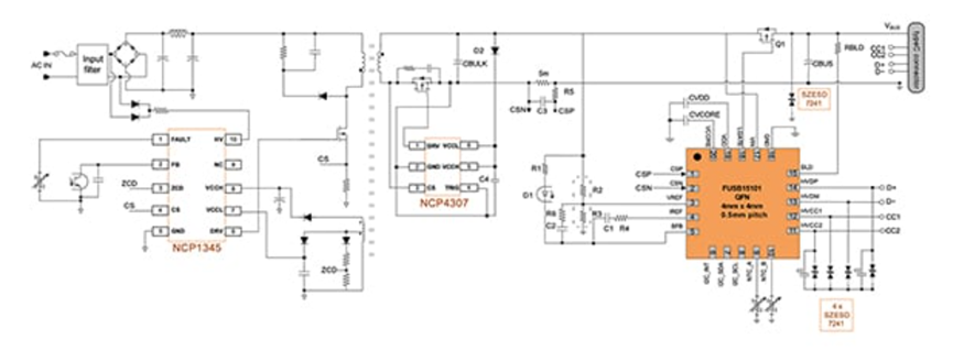 图 3:在这个 USBPD壁插式充电器解决方案中,FUSB15101 通过光耦合器控制 AC/DC *开关电源初级侧的 NCP1345 QR 反激式开关*稳压器。(图片来源:Onsemi)