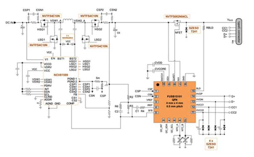 图 5:在该DC/DC 端口电流控制器应用中,FUSB15101 直接控制四级 DC/DC *转换器*控制器 NCV81599。(图片来源:Onsemi)