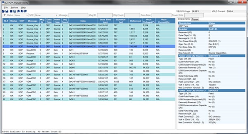 要验证两个USBPD设备之间的通信,开发人员可以使用Infineon Technologies的CY4500协议分析仪,该分析仪支持USBPD3.0 和 USB-C 规范。该分析仪可执行非侵入式测试,并准确捕捉CC 线路上的协议信息。相关的 EZ-PD分析软件详细列出了两个USBPD设备和一条 EMCA 电缆之间所有的对话信息(图 7)。