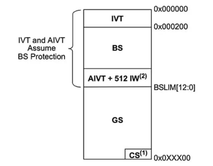 图 2:dsPIC33C DSC 和 *PIC*24F MCU 系列支持 BS 和 GS 等独立分区的代码保护。(图片来源:Microchip Technology)