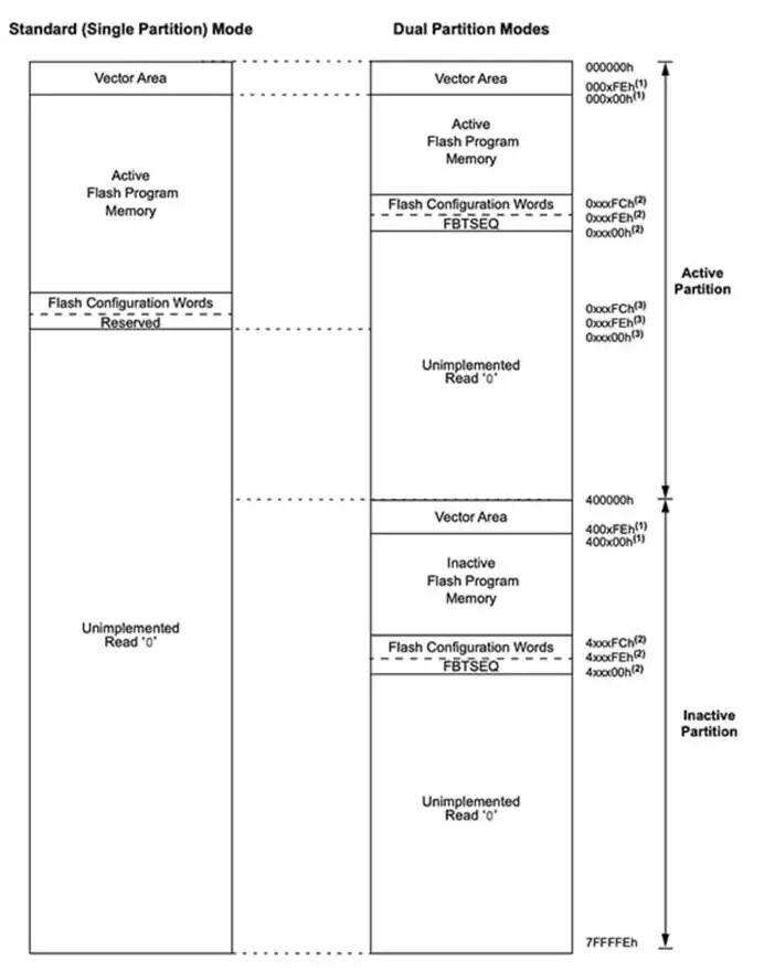 图 3:开发人员可以在默认的单分区模式或双分区模式下运行 dsPIC33C DSC 和 *PIC*24F MCU 系列。(图片来源:Microchip Technology)