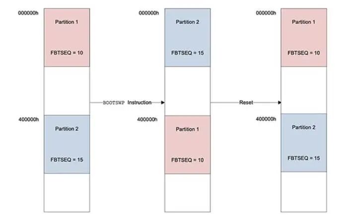 在确保更新分区成功后,可将更新分区的闪存启动顺序 (FBTSEQ) 设置为低于原始分区的值。在随后的器件重置中,器件将启动到具有较低FBTSEQ 值的更新分区(图 5)。