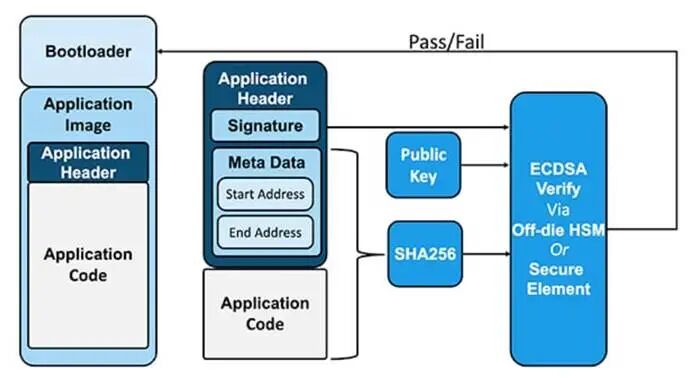 图 8:在目标系统中,为了确保在引导程序更新固件之前进行代码验证,ATECC608 或 TA100 等安全 *IC*提供的基于硬件的验证功能是至关重要的。(图片来源:Microchip Technology)