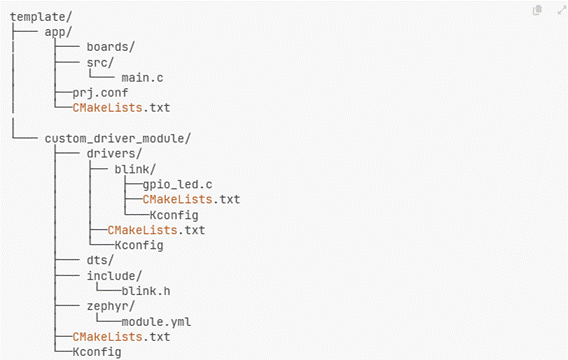 本示例的项目代码基于 Zephyr RTOS 应用程序模板进行开发,项目目录结构如下: