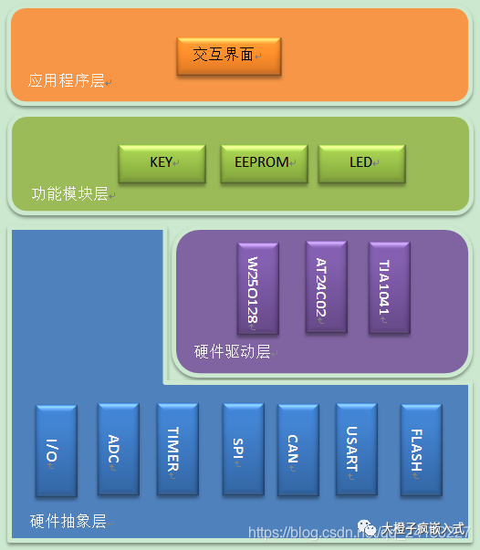 比如KEY、LED和EEPROM等功能,其中LEY、LED基本调用硬件抽象层的API函数(更复杂的可能通过片外芯片获取/控制等,因此可能也需要使用硬件驱动层),EEPROM调用硬件驱动层的API函数,即使EEPROM芯片更换(AT24C02或W25Q128等),也不影响EEPROM之前编写含的功能代码程序(前提是AT24C02,W25Q128提供的API函数提供的是统一标准)。