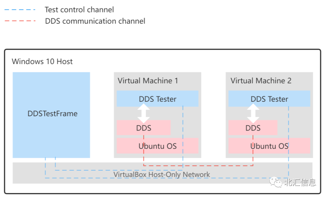 测试环境如图2所示,为便于展示,被测系统为Windows主机中运行的两台Ubuntu虚拟机,两台虚拟机中均运行DDS Tester。被测DDS为某DDS中间件产品,目前在汽车行业内已经得到较广应用。