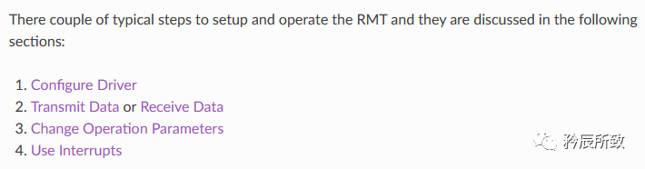 RMT 的使用基本步骤如下,但是本文我们是需要控制 SK6812 ,所以只需要了解发送相关的配置及使用: