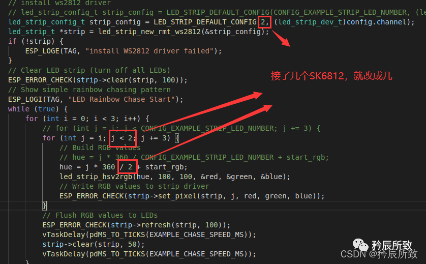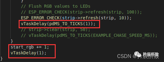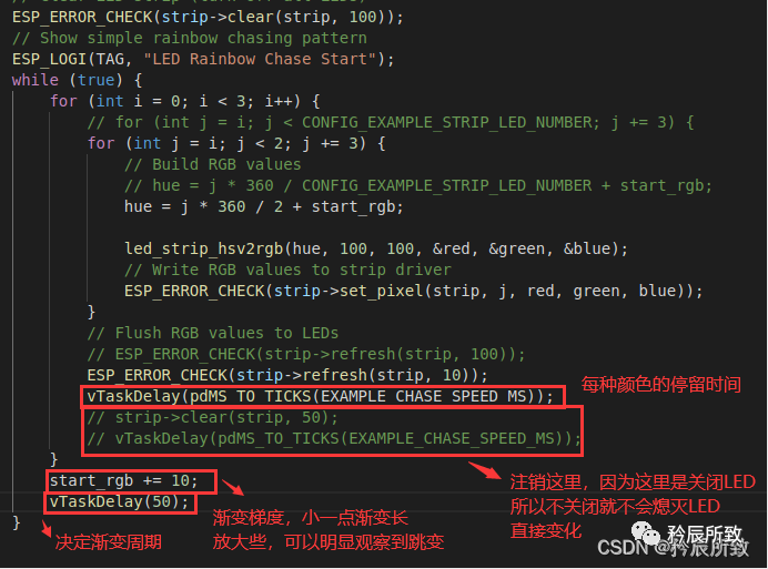 最开始也没有一点一点的去分析驱动代码,示例代码也就看看 RMT 的配置,后面的 SK6812 驱动部分并没有仔细研究,所以测试是闪烁效果,后来想想还是不得劲,不渐变闪烁,这不得亮瞎眼= =!
