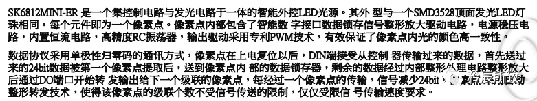 SK6812 灯珠集成了 控制电路与发光电路与一体的智能外控 LED 光源。外形与 5050 LED 灯珠是一样的。但是与普通的 LED 不同的是,他不是简单的通过高低电平来控制亮灭, 它通过 单线就能控制 RGB 三色的亮灭,采用了一个叫 单极性归零码 数据协议的通讯方式。