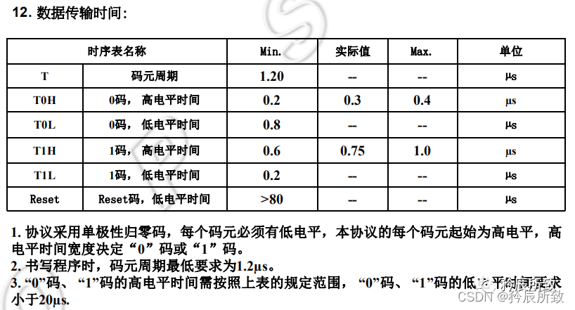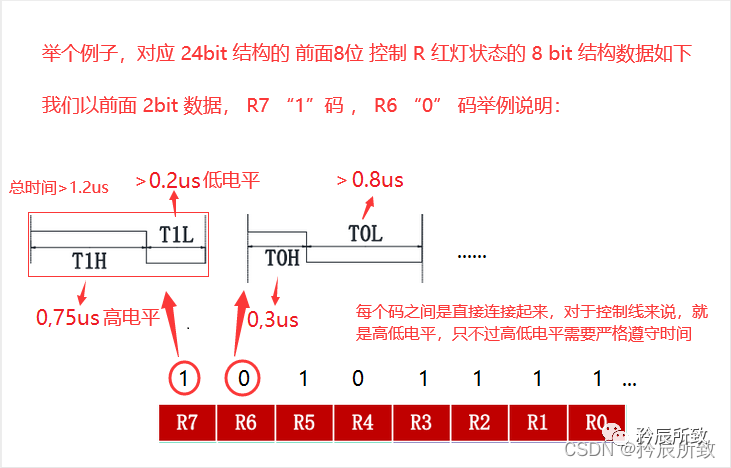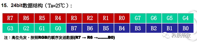 对于使用者来说,我们需要知道的主要是理解这个协议,然后实现手册中提到的 “0”码 和“1”码,然后每一个灯珠,是由 24 bit 的数据结构组成。(注意这里说的 24 bit 是数据结构,举个例子, 如果我们使用SPI实现“0” 、“1” 码,SPI 总线发送一个字节,只是实现了一个 码,只是上面 24 bit 数据结构中的 1bit !后面会更加详细的说明这一点)