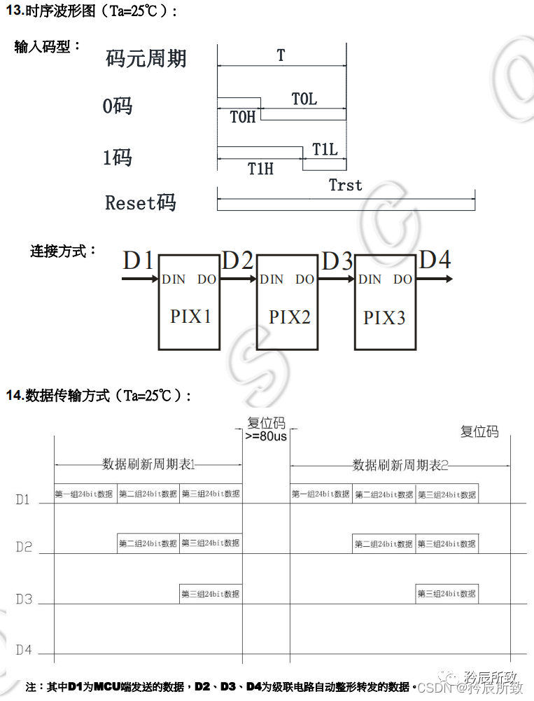 LED在上电复位后,通过 DIN 端口接收 控制器来的数据,首先送过来的 24bit 数据被第一个 灯珠提取,
