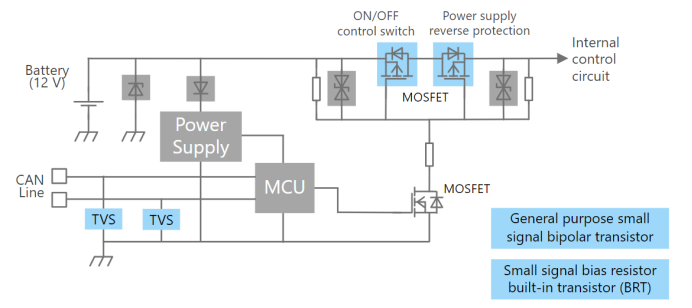 任何优秀的控制系统都离不开一个安全可靠的电源前端。车载环境电源状况复杂,反接、浪涌等风险不容忽视。东芝提供了一套完整的电源开关控制与保护电路方案。