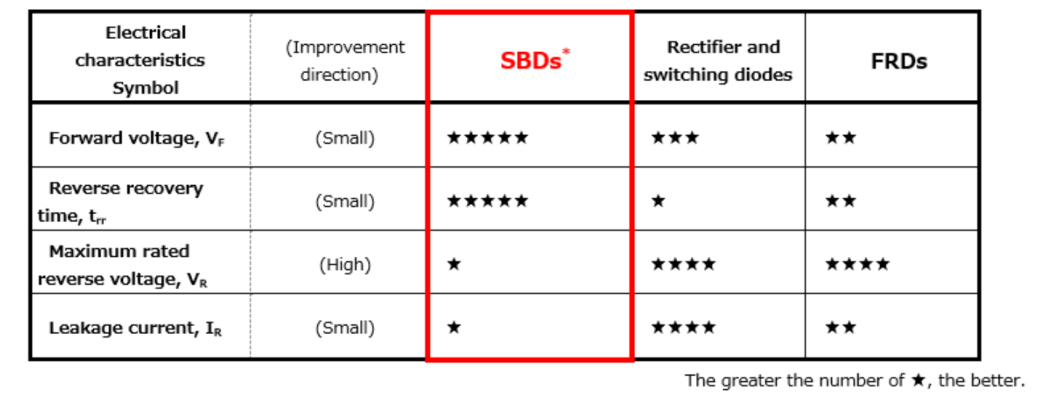 下表比较了SBD与整流二极管、开关二极管和FRD。反向恢复时间是二极管关断的一个限制因素。SBD具有正向电压低和反向恢复时间短等优点,其缺点包括最大额定反向电压(VR)低和VR下更大的泄漏电流。