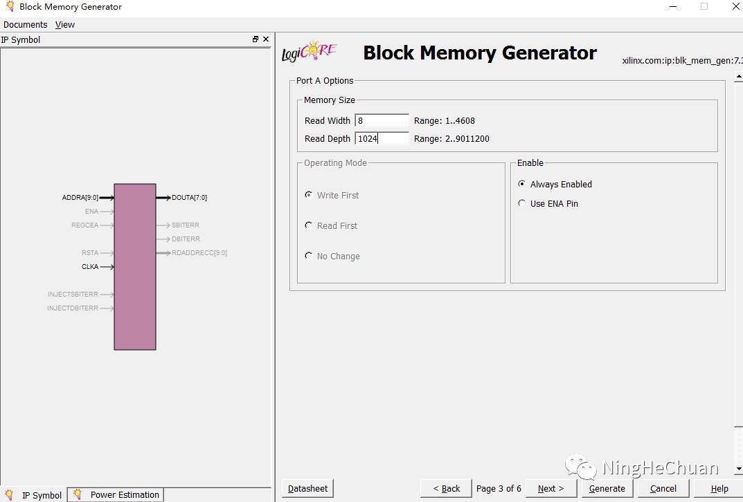 这里要填写数据位宽和深度,位宽是你所需要输出的数据位宽,LCD有8个数据位,故这里定义位宽为8,深度即有多少个这样的数据,从取模出来的数据看,易得共有1024个数据位。我使用的basys2开发板使用的是Xilinx Spantan3E—100TQ144 FPGA包含73728位的块RAM/ROM。因此,使用的块RAM的最大容量为9216字节或4608个16位字。从这里来看,是完全够用的。