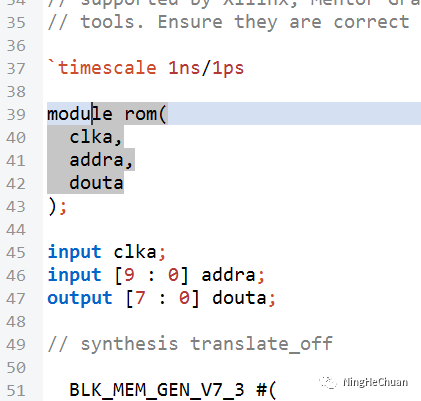 将rom.v文件打开端口定义如下,直接在顶层文件对其实例化,如代码所示