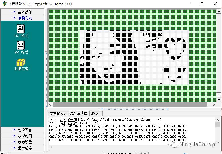 该实验最让我头疼的是调用ROM,第一次接触IP核有许多地方都完全不懂。用LCD(带中文字库)显示文字的时候,可以直接输入文字的十六进制数值,设置显示地址坐标即可,12864显示原理点阵控制点的亮灭来实现,但是如果要显示图片的话一个个输入难免太过麻烦,这个时候调用ROM就方便许多。找一张或做一张像素为128x64的单色图片,使用取模软件,按c51的方式取模。取模出来的数据为十六进制,行8个,64个。