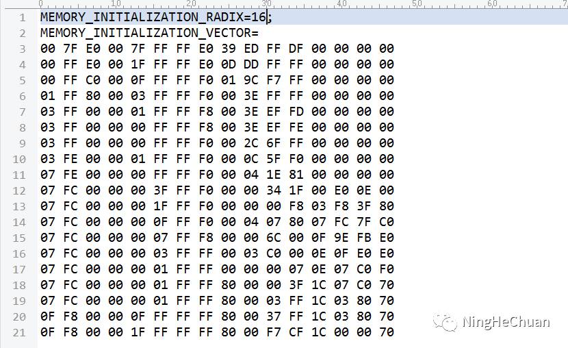 将图片取模出来的每个数据前的ox去掉,这只是C语言中16进制的表示形式,文件第一行的MEMORY_INITIALIZATION_RADIX=16;表示数据全都为16进制数,这里的16可以换成8、2、10都行。