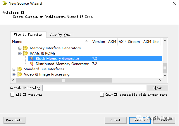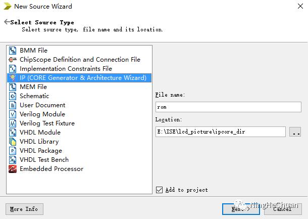 打开ISE建立工程后,新建文件,选择IP(CORE Generator & Architecture Wizard),填写文件名,next