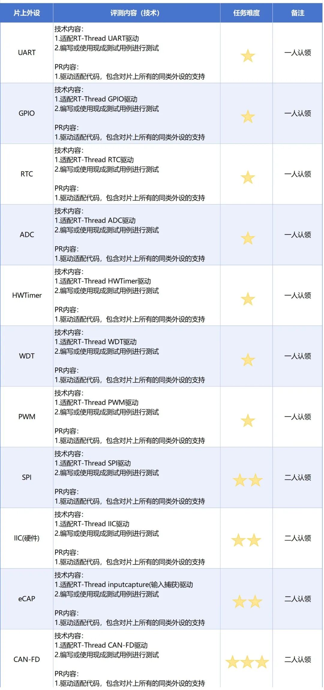 开发板的外设功能模块,每个外设模块的评测为一个任务,每位参与者领取一个功能模块任务即可, 完成任务后请在RT-Thread论坛提交评测文章。(任务见下方,*为必做任务,任务未完成的开发者,需寄回评测开发板!)