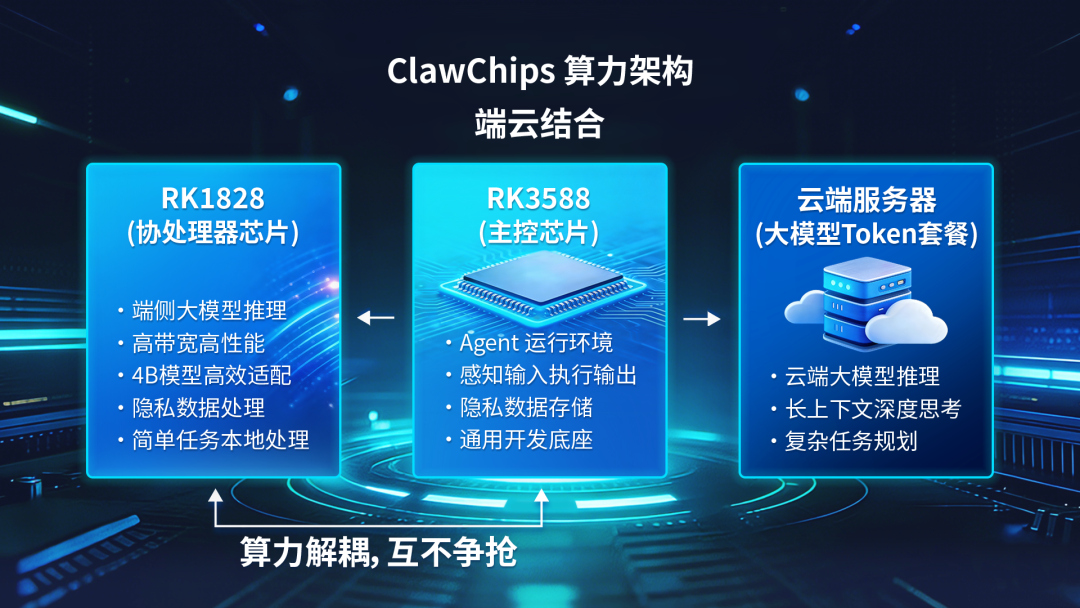ClawChips 的核心竞争力,源于瑞芯微为端侧龙虾量身打造的算力组合,这也是瑞芯微 AIoT2.0 算力解耦战略的核心落地,实现「主控沙箱 + 协处理器推理」的算力协同,可作为龙虾开发与运行的专属算力底座。