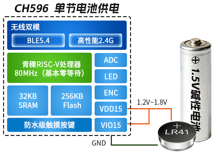 常规蓝牙芯片工作电压多在1.7V~3.3V之间,单节电池电压不够,需外部DCDC升压,或采用多节电池串联供电并结合片内DCDC降低功耗。这种传统方式使用外部电感等分立器件、挤占PCB面积,还可能带来EMI干扰。CH596支持1.2V~1.8V工作电压,可单节电池供电,无需外围电感,成本更省,为便携式医疗健康设备、智能家居设备、可穿戴产品提供小型化、轻薄化的解决方案。