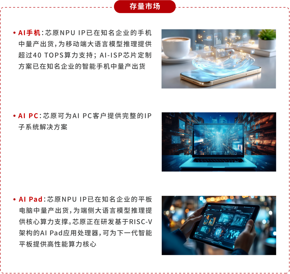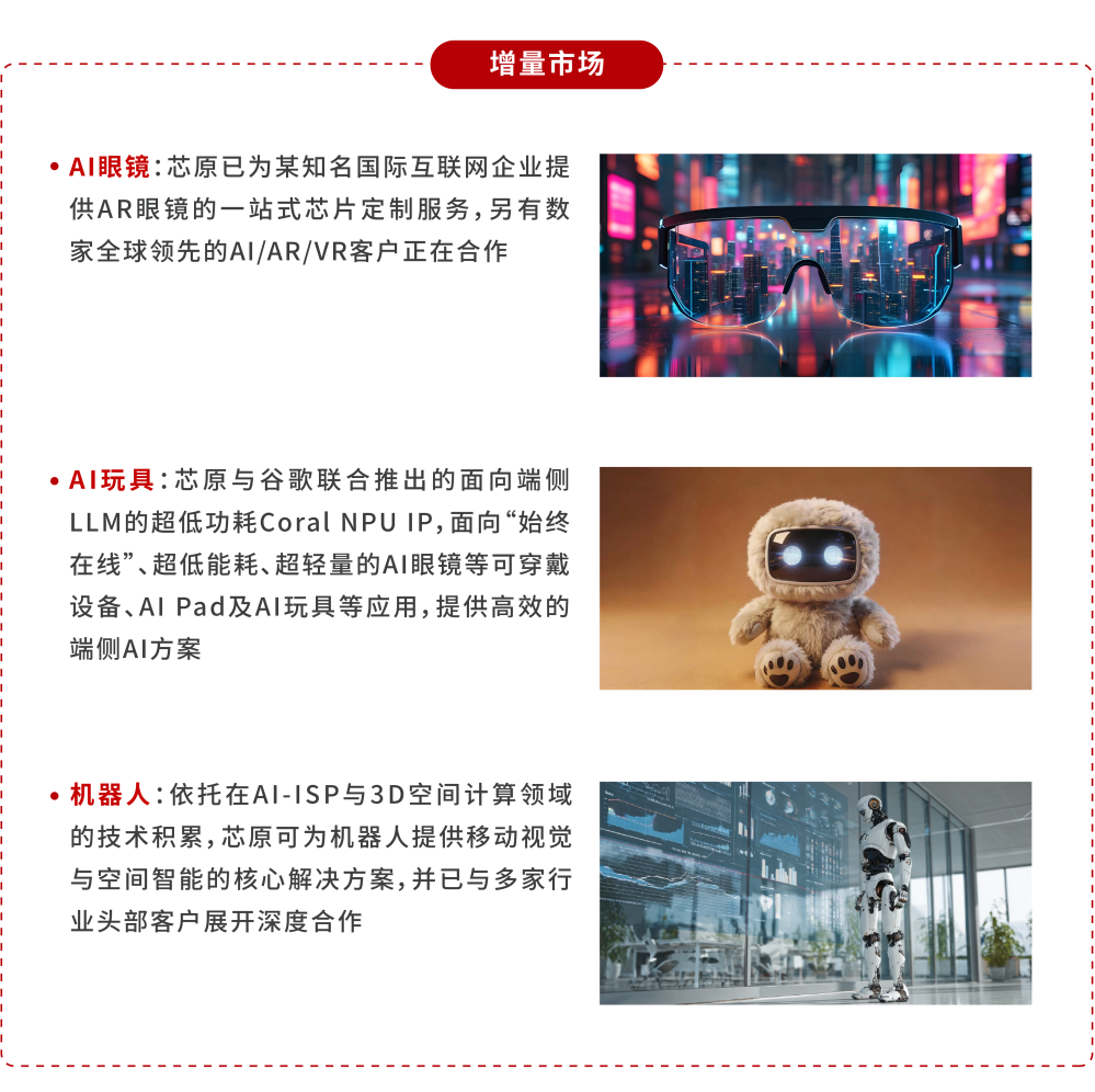 基于自有的IP,公司已拥有丰富的面向人工智能 (AI) 应用的软硬件芯片定制平台解决方案,涵盖如智能手表、AI/AR眼镜等始终在线 (Always-on) 的轻量化空间计算设备,AI PC、AI手机、智慧汽车、机器人等高效率端侧计算设备,以及数据中心/服务器等高性能云侧计算设备。