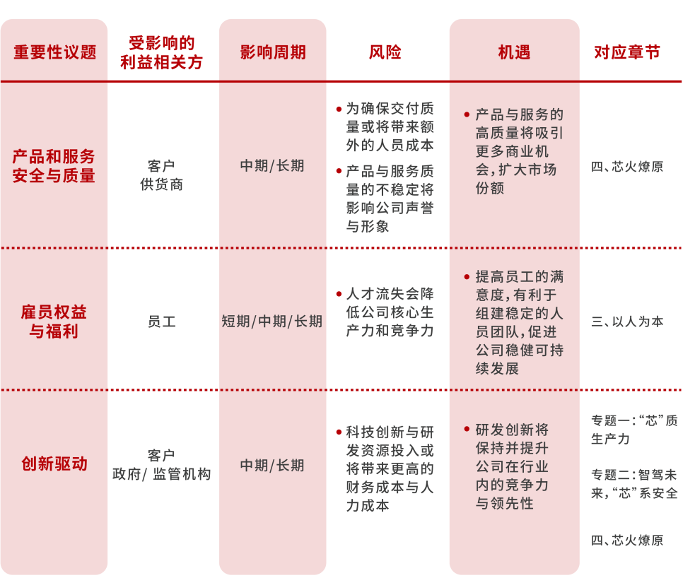 2025年,我们遵循双重重要性评估原则,结合《上海证券交易所上市公司自律监管指引第14号⸺可持续发展报告 (试行)》,识别出了27项与公司相关的实质性议题,将产品和服务安全与质量、雇员权益与福利、创新驱动议题识别为同时具有财务重要性与影响重要性的议题,给予更多关注。