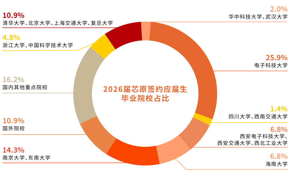 芯原股份2026届校园招聘空中宣讲会累计观看量近150,000人次,应届生投递简历人数超11,000份,8,000人参加了在线笔试,超1,700人进入面试。与芯原成功签约的100余名应届生中,硕士毕业于985、211院校占比100%,本硕均毕业于985、211院校占比94%。