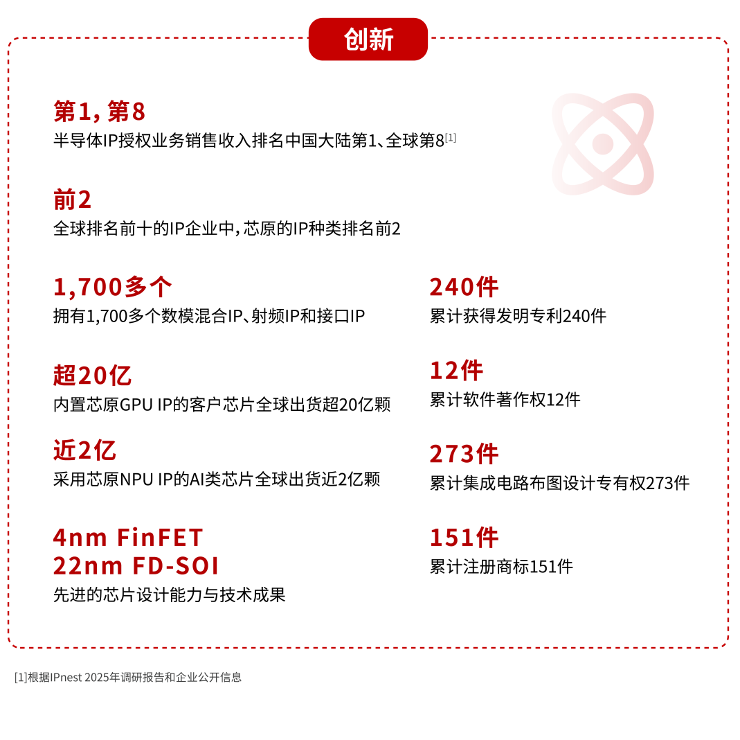 公司拥有自主可控的图形处理器IP (GPU IP)、神经网络处理器IP (NPU IP)、视频处理器IP (VPU IP)、数字信号处理器IP (DSP IP)、图像信号处理器IP (ISP IP) 和显示处理器IP (Display Processing IP) 这六类处理器IP,以及1,700多个数模混合IP、射频IP和接口IP。