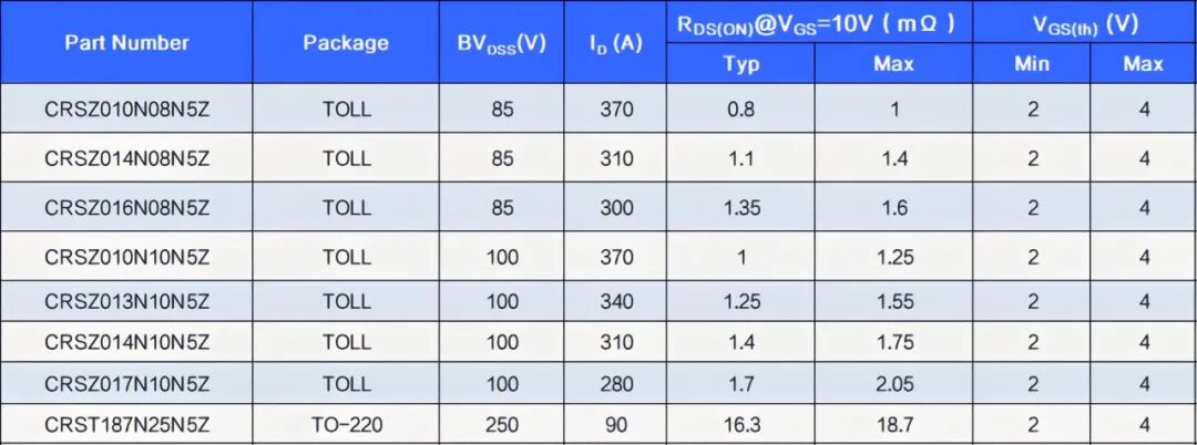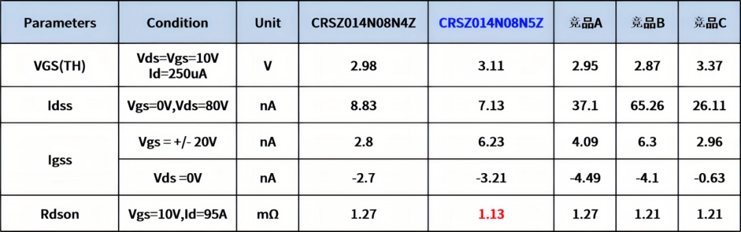 - 实测参数对标:与业界主流产品(最大导通电阻约为1.4mΩ规格)相比,CRSZ014N08N5Z的实测RDS(on)最低。其VTH典型值3.1V,既兼顾了稳态开通时,沟道全打开低RDS(on)的要求,又可以在关断时获得更快的关断阈值。