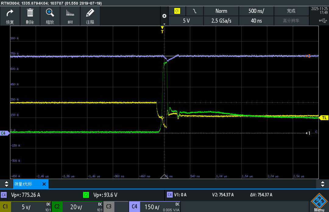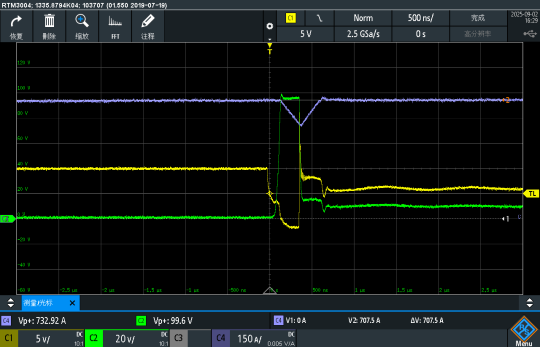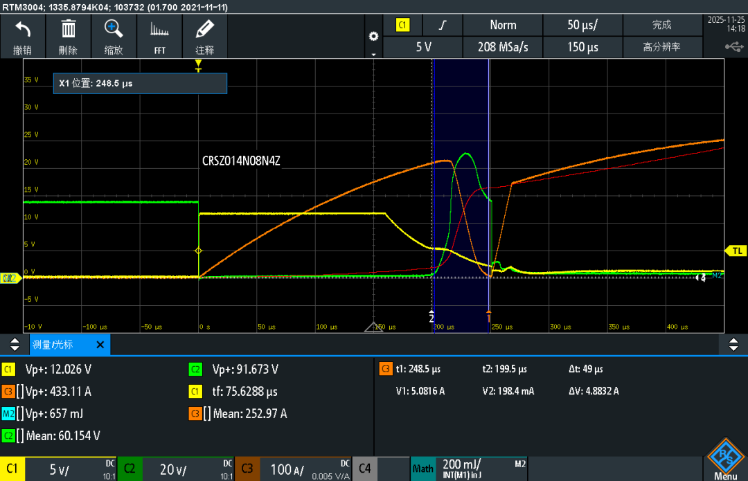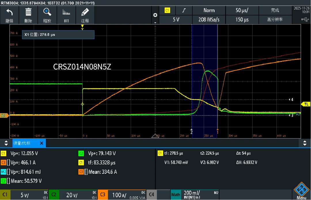 实测对比波形显示,在相同的Roff条件下模拟BMS应用慢关断能力,CRSZ014N08N5Z的短路电流冲击能力较上一代产品显著提升,使BMS应对极端情况时优势突出。