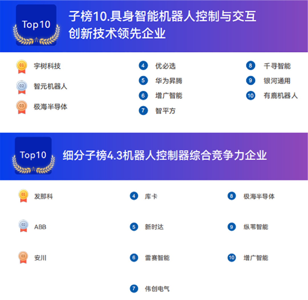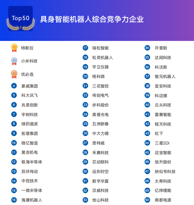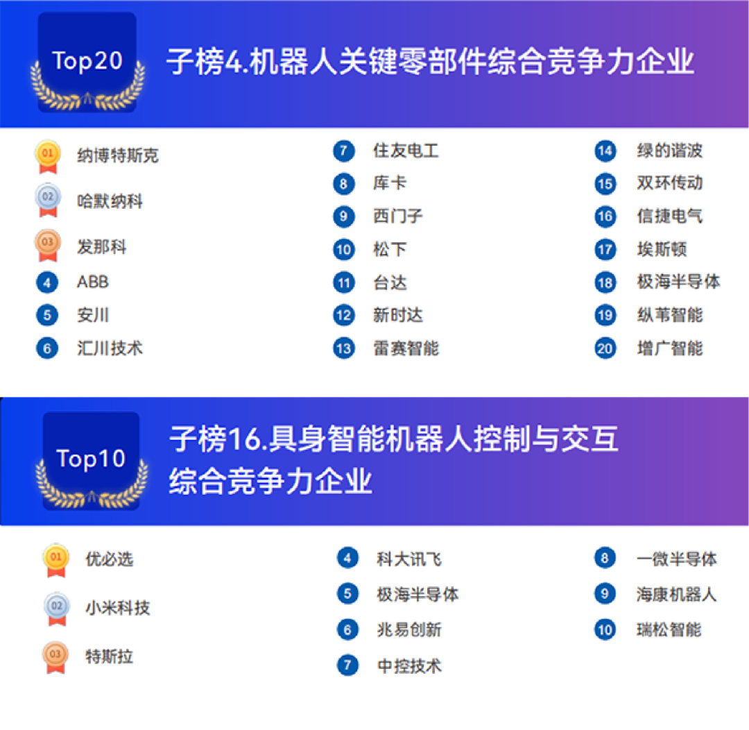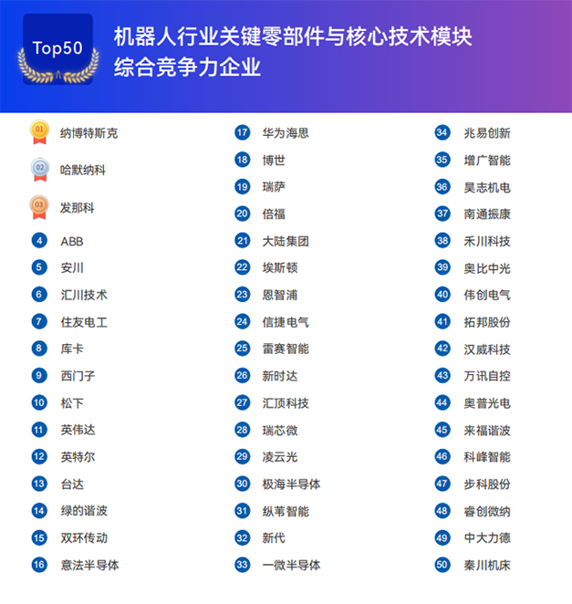 机器人行业关键零部件与核心技术模块综合竞争力企业Top50