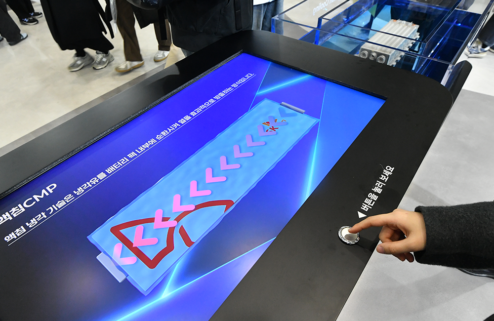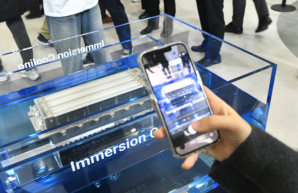 通过这个模型,可以直观地确认SK On的技术力。当参观者按下按钮,浸在蓝色冷却液中的双槽内,模组缓缓升起又徐徐浸没,这一直观的"浸入"演示,让浸没式冷却的原理瞬间深入人心。
