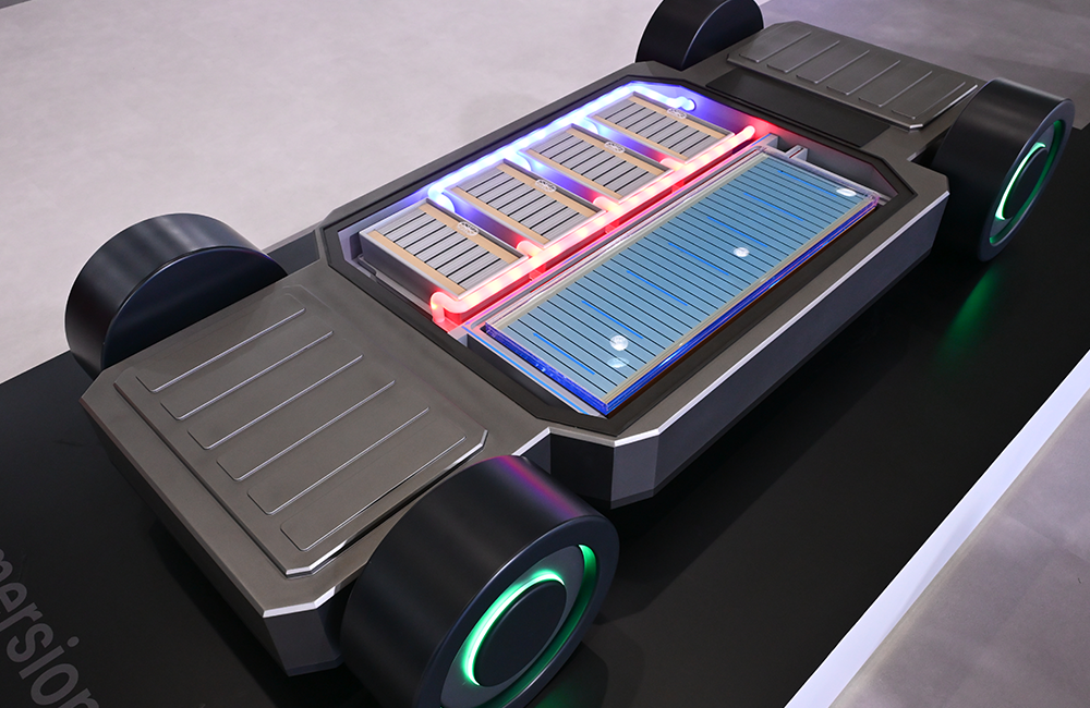 紧接着,一个完美复刻电动汽车底部结构的模型,将人们的视线引向了SK On与SK Enmove共同研发的"浸没式冷却电池包"。