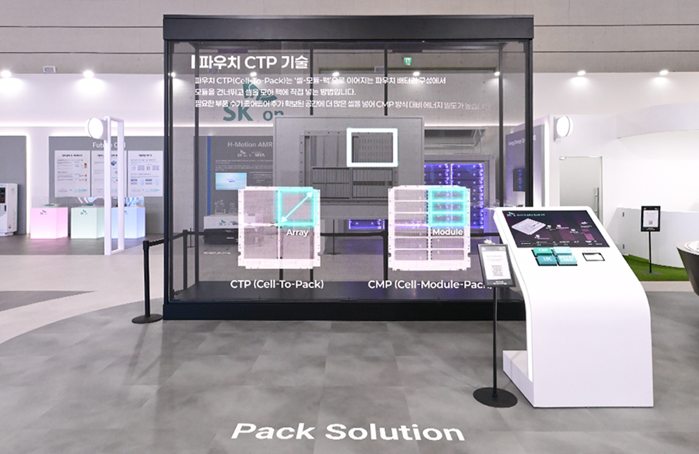 这项技术通过让绝缘冷却液在电池包内部循环,实现精准控温,从而大幅提升电芯的稳定性。现场,SK On还展示了跳过模组环节的pouch CTP(Cell To Pack)方案,以及基于传统CMP(Cell-Module-Pack)架构的"浸没式冷却包"模型。
