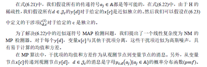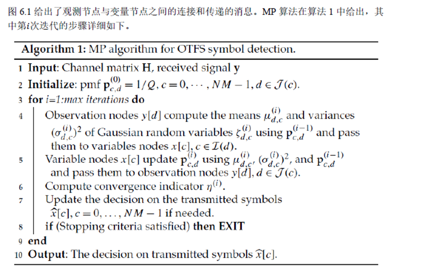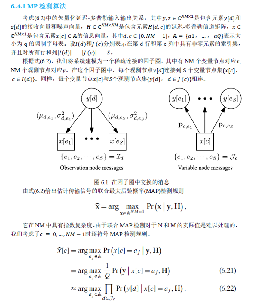 在本节中,我们介绍OTFS的最新消息传递(MP)检测。LMMSE检测可以在双选择信道中提供良好的性能,但代价是高复杂性,如上所述。然而,单抽头均衡需要最低的复杂性,但其性能随着多普勒频移的增加而下降。MP检测可以提供比LMMSE检测更好的性能,且复杂度低得多,并且可以应用于所有OTFS变体。