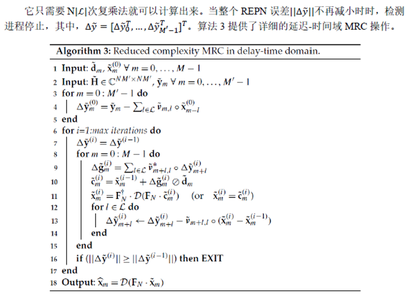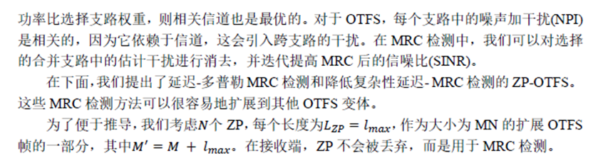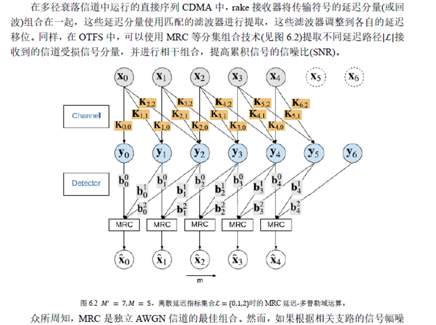 在本节中,我们讨论最大比率合并(MRC)检测,它提供与MP检测相似的性能,但复杂性要低得多。本文提出的MRC检测方法是受码分多址(CDMA)系统中传统rake接收机的启发,因为OTFS可以被解释为具有时间和频率扩展的信息符号的二维CDMA。