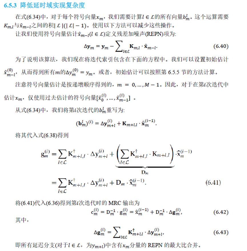 首先,第6.5.5节中提出的单抽头MMSE均衡器提供的QAM符号的初始估计被馈送到MRC检测器中,生成比特级对数似然比(LLR)。输出的LLR进一步经过随机去交织和LDPC解码处理,生成硬判决编码位。这些编码位被交织,QAM调制,并反馈给MRC检测器作为更新的输入符号向量估计。这完成了一个涡轮迭代。该过程重复,最后一次涡轮迭代输出LDPC解码的信息位。