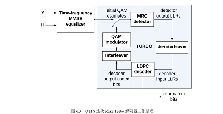 在发送端,信息位由LDPC编码器编码,然后是随机交织器。交错编码位被映射到QAM符号,这些QAM符号通过OTFS调制产生时域信号。在接收端,可以采用迭代的方式进行MRC联合检测和解码(即迭代rake turbo译码器),如图6.3所示。
