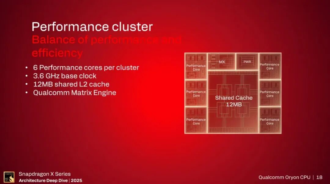 Oryon CPU一共集成了3个CPU的cluster,1和2 cluster每个集成6个Prime核,3 cluster集成6个优化功耗面积的Performance核,一共18个核。实际高通命名的Prime核一般我们习惯称为性能核Performance Core,而高通所说的性能核实际是我们习惯说的能效核Efficient Core。而用户又习惯称为“大小核”,但是“大小核”名声不好,估计是这个原因,改个名字。