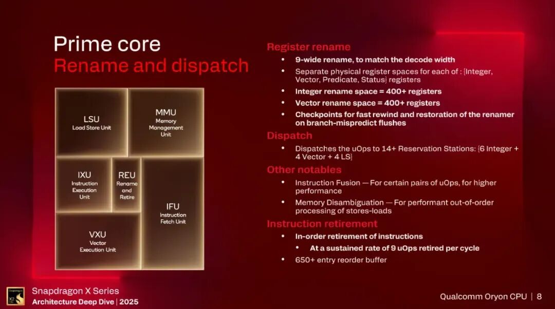 和Decode宽度匹配的Rename宽度,同样是9。整数,向量有独立的物理寄存器files,都是400+。checkpoint属于常规的技术支持了。同样支持指令融合技术,多数的核也都会支持,只是看最终能支持多少类型。每个周期能退休9个uOps,ROB有650+的条目。