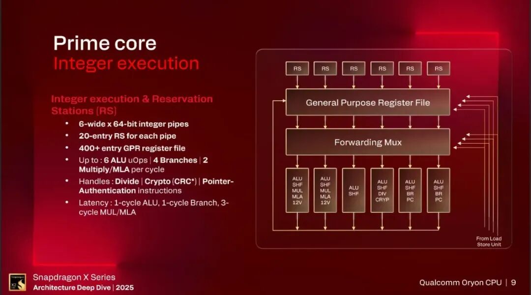 6宽的64bit的整数执行流水线,400+的GPR,每个cycle最多有6个uOps,4个分支,2个MUL/MLA。4个分支执行单元是比较多的,看图上只画了2个,可能是有2个分支执行单元,然后2个复用的流水线。延迟方面就是1-cycle ALU,1-cycle Branch,3-cycle MUL/MLA。