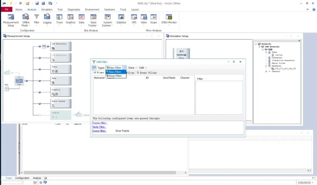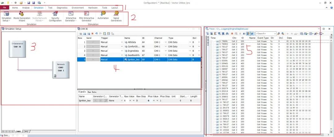 菜单栏主要是对导航栏的细化,主界面主要包括Simulation Setup,用IG模块模拟发送报文,或者用replay模块回放报文,建立capl模块等等,Trace界面主要用于CAN、以太网信号的显示。