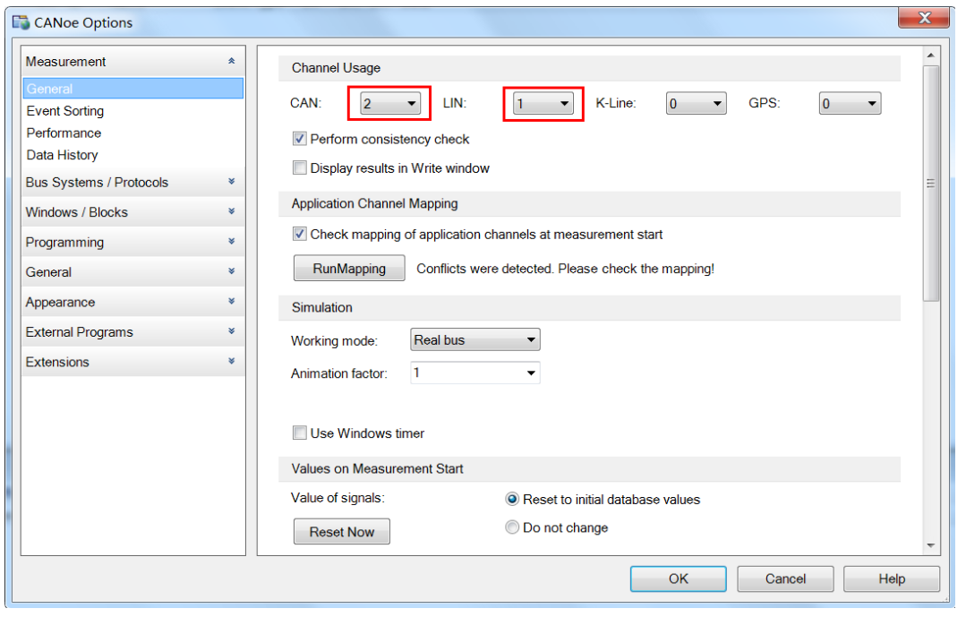 然后点击Configuration→Options,弹出CANoe Options 窗口,左边栏默认为General,在General配置中,需要选择通道的使用情况,注意这里选择的通道数不能超过 CANoe 实际的通道数。最后点击OK。