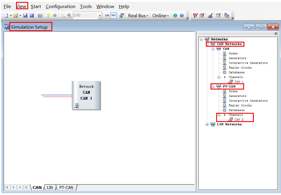 然后就是加载dbc了,点击菜单栏 View→Simulation Setup,弹出 CAN 模拟窗口,在窗口右侧的 CAN Network 上右击,增加CAN通道,然后在database出添加相应通达的dbc即可。