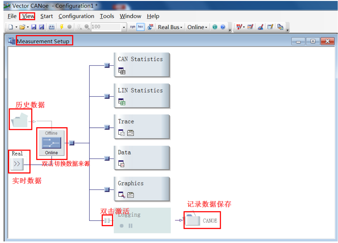 然后点击菜单栏 View→Measurement Setup,设置是否记录数据,以及数据时来源离线播放还是实际测试。